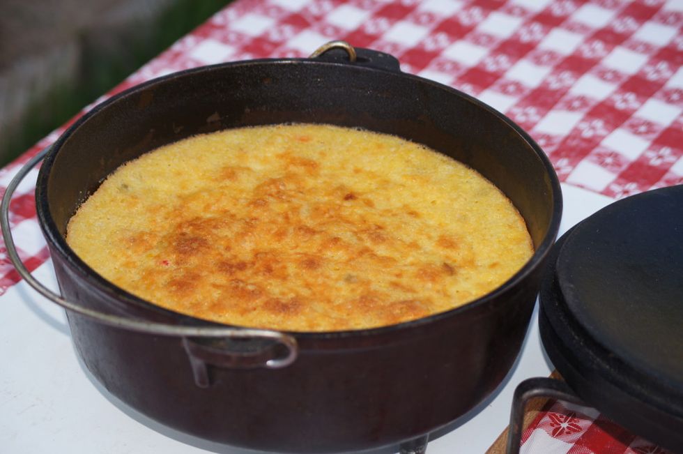 In a 10 inch Dutch Oven sauté bell pepper and onion in the butter until tender and crisp. Combine the muffin mix, eggs, cream style corn, un-drained whole corn, and green chilies in a bowl and mix well. Add...