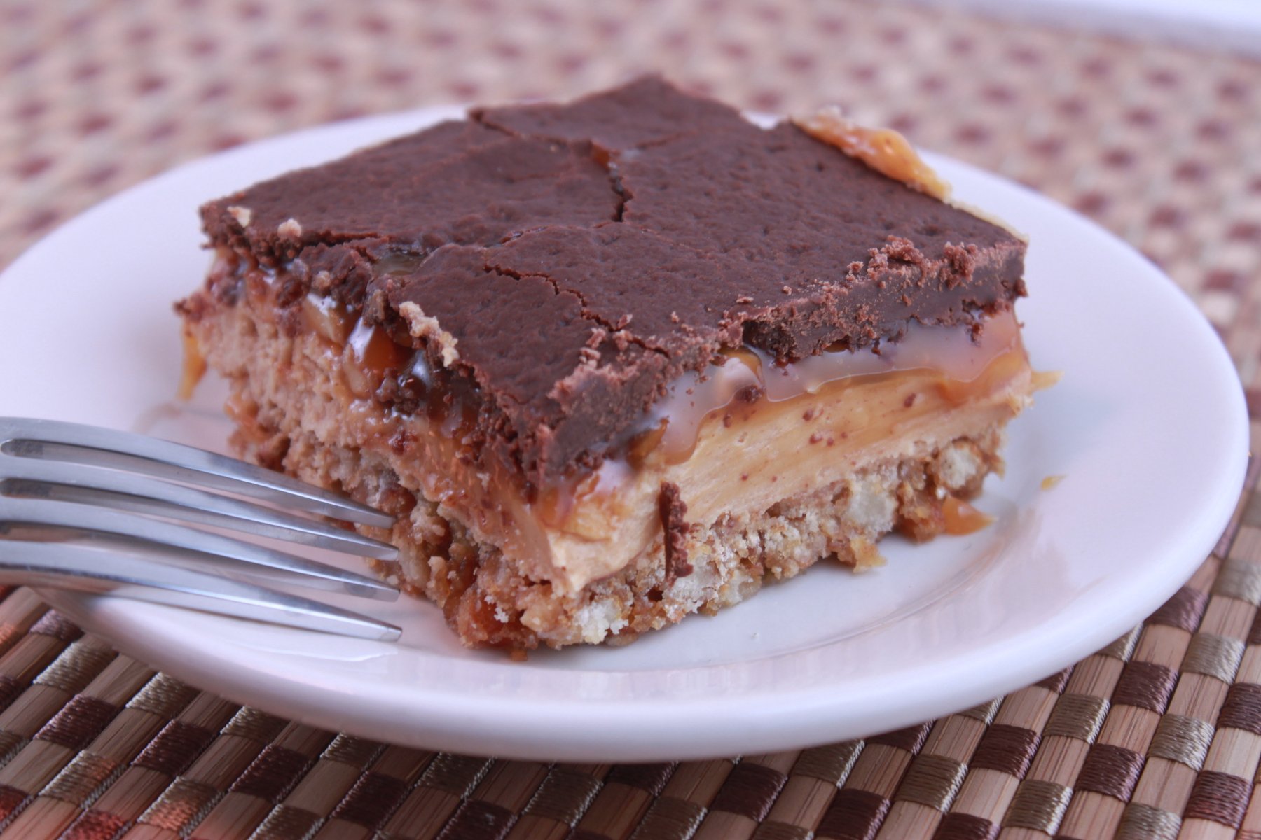 In a large bowl combine the crushed pretzels, melted butter and brown sugar. Stir to combine. Press into...