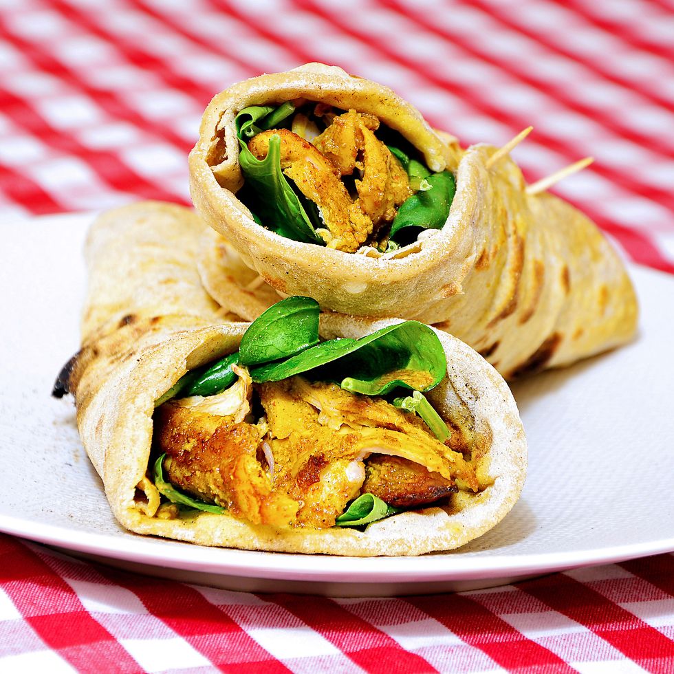A simple and delicious snack made with Indian grilled chicken called the tandoori wrapped in the whole wheat Indian flat bread called the roti.