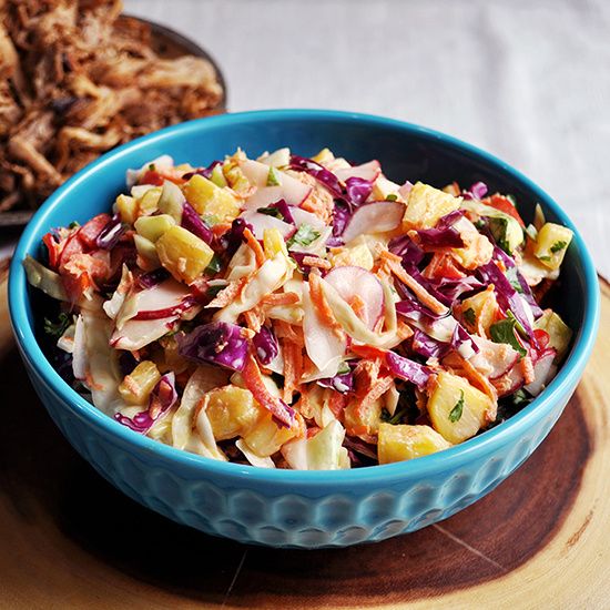Shredded cabbage, carrots, red bell pepper, and radishes are combined with a jalapeño spiked dressing, chunks of pineapple and fresh cilantro for a coleslaw that's a deliciously surprising study in flavors and textures.