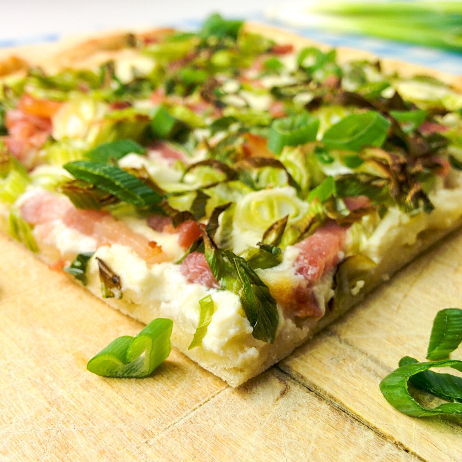 Tarte Flambee from French Alsace InJohnnysKitchenJune 08, 2020 50 Photo by www.injohnnyskitchen.com Crispy dough with a layer of creme fraiche, topped with diced bacon and spring onions. A pizza-like treat from the French Alsace regionTry itSee the full directions on my site
