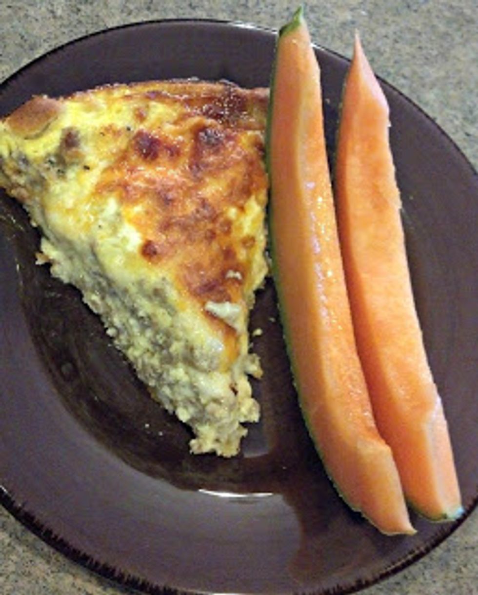 Preheat oven to 375 degrees. Prepare pan (I use a round stone casserole, but I'd suggest an 8x8 or 9x9 dish if you don't have one like mine) with cooking spray (not if you are using stone!). Combine eggs...