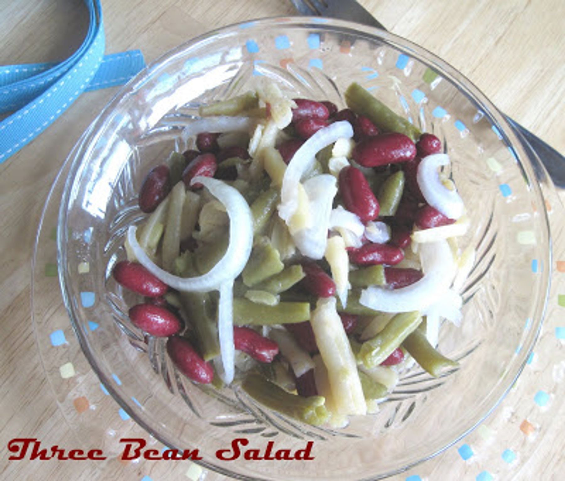 1 - 16 ozs. can green beans, drained 1 - 16 ozs. can wax beans, drained 1 - 16 ozs. can kidney beans, rinsed and drained chopped green pepper to taste (I'm not a fan of peppers, so they were omitted) chopped onions to taste 3/4 c. sugar 1/2 c. apple cider vinegar 1/3 c. salad oil 1 tsp. salt 1/4 tsp. pepper