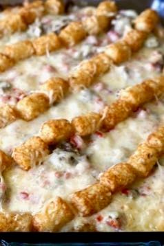 In a skillet cook and crumble the sausage until completely cooked. Reserve 2 cups of tater tots and place the remaining...
