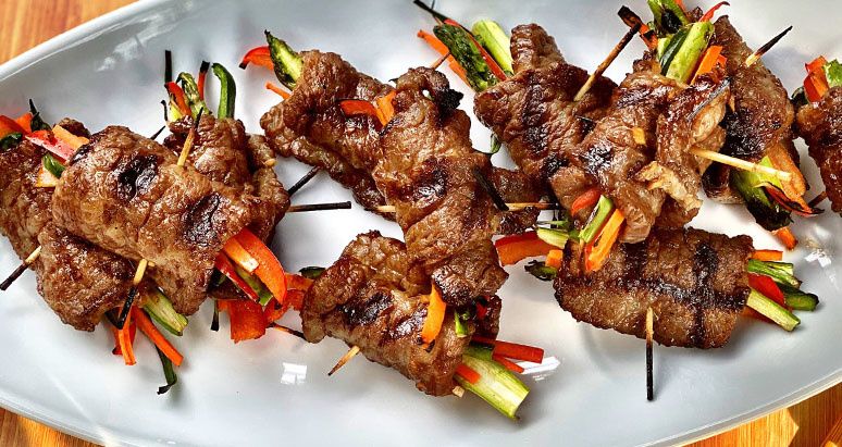 Perfect for dinner or an appetizer, these teriyaki steak rolls with Miyazakigyu Wagyu beef are savory and delicious! The tender, marinated beef is filled with tasty vegetables, rolled, sealed, and grilled to perfection. Dip each steak roll in the warm teriyaki sauce, and revel in every bite! Try this recipe at your next backyard BBQ!