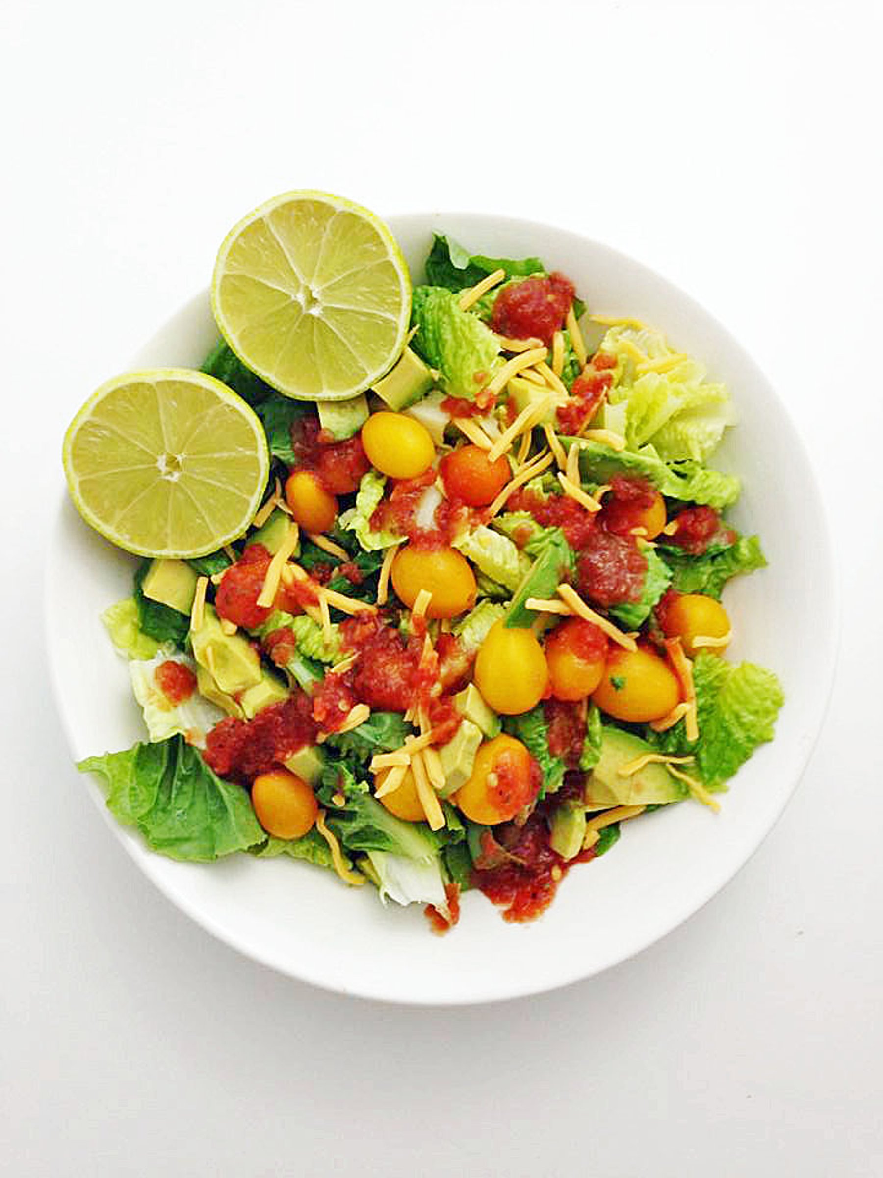 In a large bowl, toss lettuce, cherry tomatoes, avocado, lime juice, cheddar cheese and salsa.