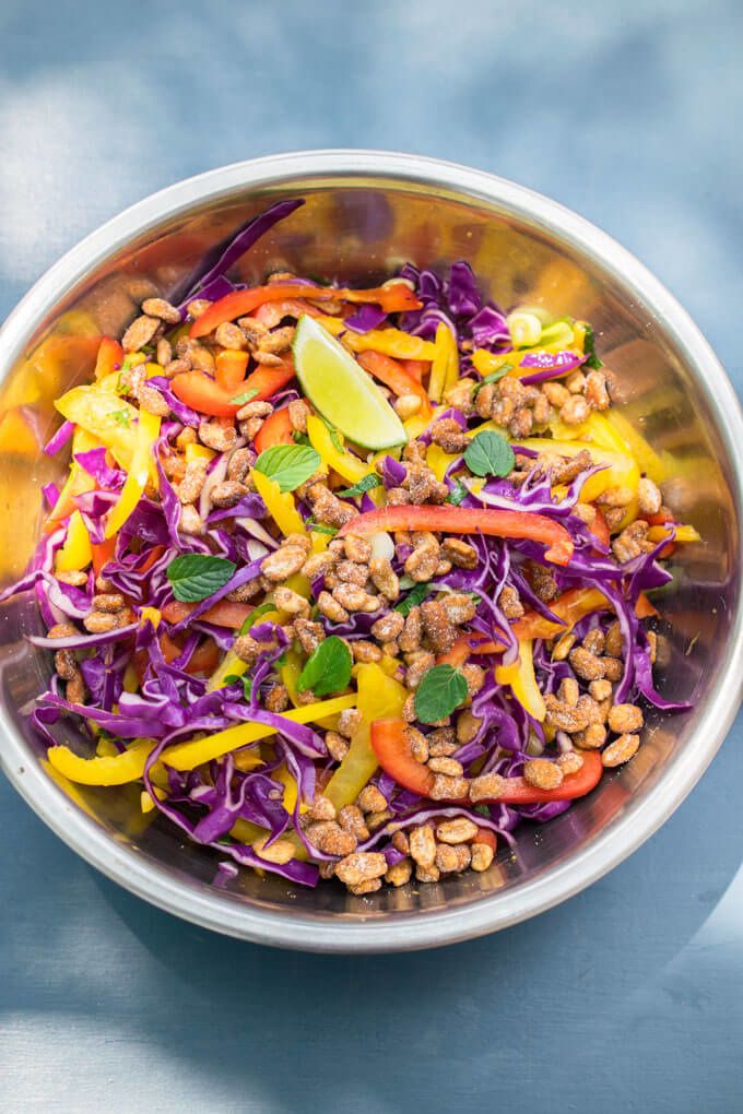 Prepare the red curry vinaigrette by whisking together all of the ingredients. In a mixing bowl, mix together the cabbage, mango, bell pepper, scallions, mint, and basil. Drizzle the red curry dressing...
