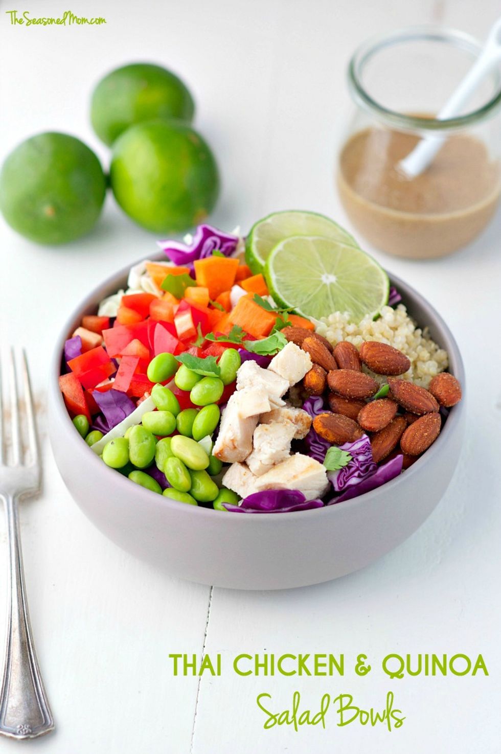 These healthy, high-protein Thai Chicken and Quinoa Salad Bowls are loaded with cool and crisp veggies, garnished with bold and crunchy almonds, and smothered in a creamy Almond Sesame Dressing. With so much flavor and texture, this is a 15-minute meal that will fill you up and keep you going through your workouts, summer adventures, and busy workdays!