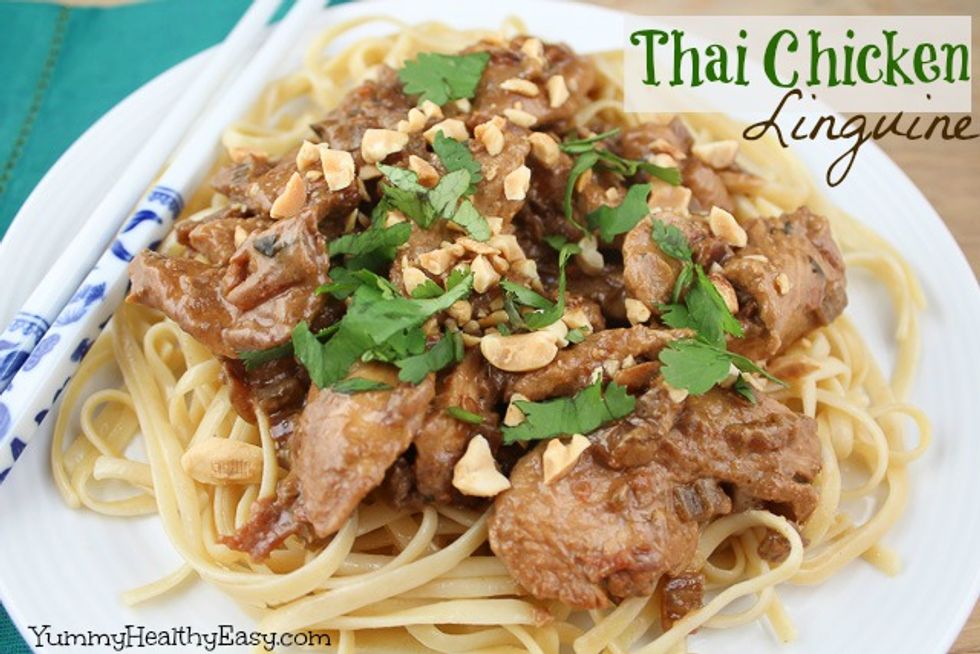Sliced chicken marinates in chopped vegetables and a yummy soy and peanut sauce and then is easily cooked up in a skillet and served over linguine pasta. So flavorful and delicious!