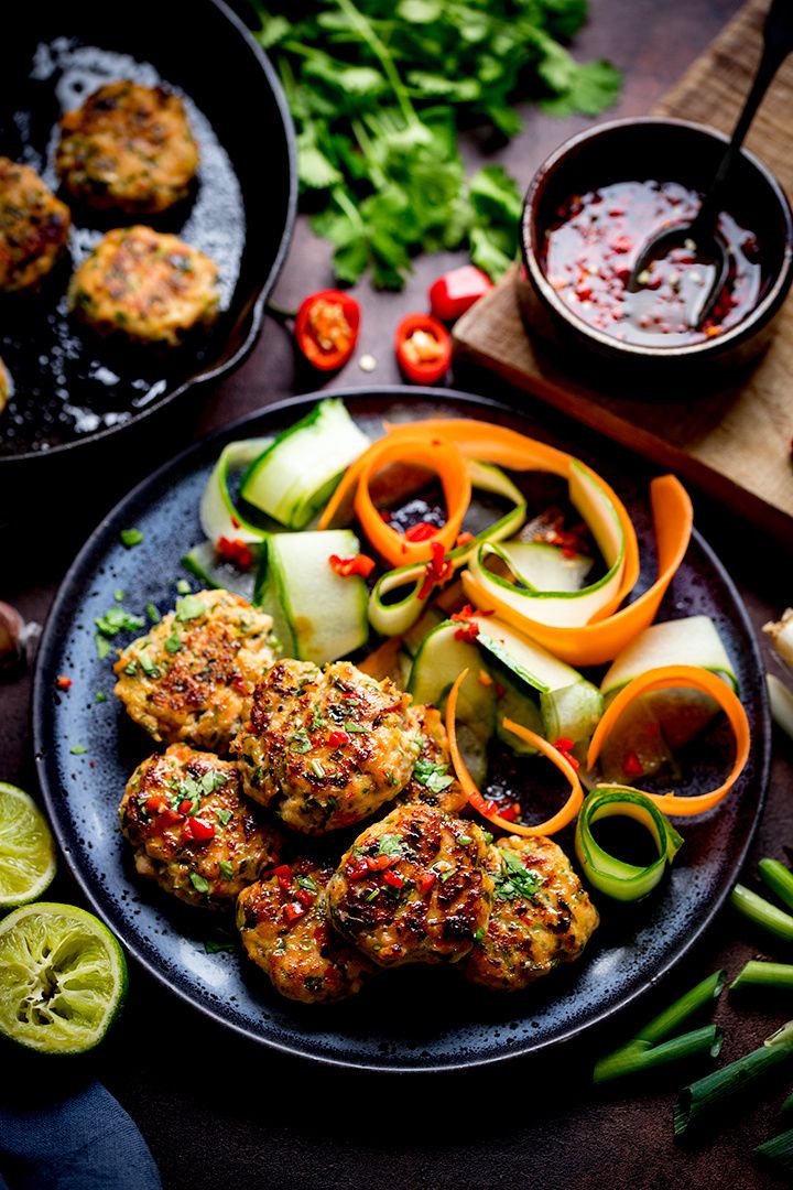 Thai fishcakes with vegetable ribbons and fresh chilli dipping sauce. A delicious, easy Summer dinner, packed with flavour.