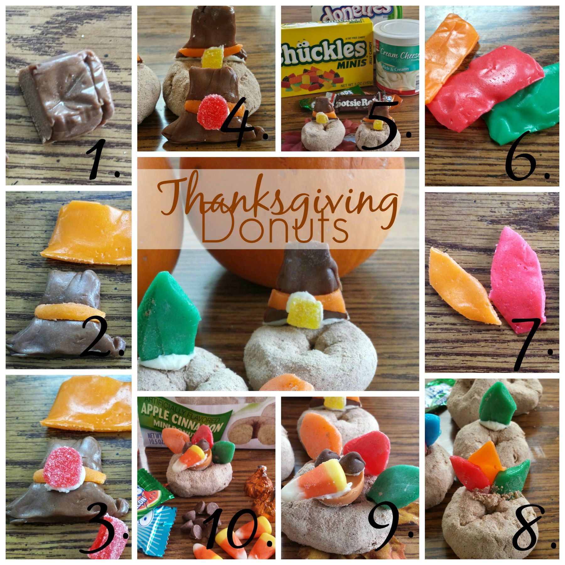 These Thanksgiving donuts were inspired by tootsie rolls and airheads that we found among all our Halloween candy! Before long these sticky, chewy colorful candies were made into pilgrim hats, Indian and turkey feathers. We stuck our fun candy Thanksgiving shapes into donuts to make this a real holiday sweet treat!
