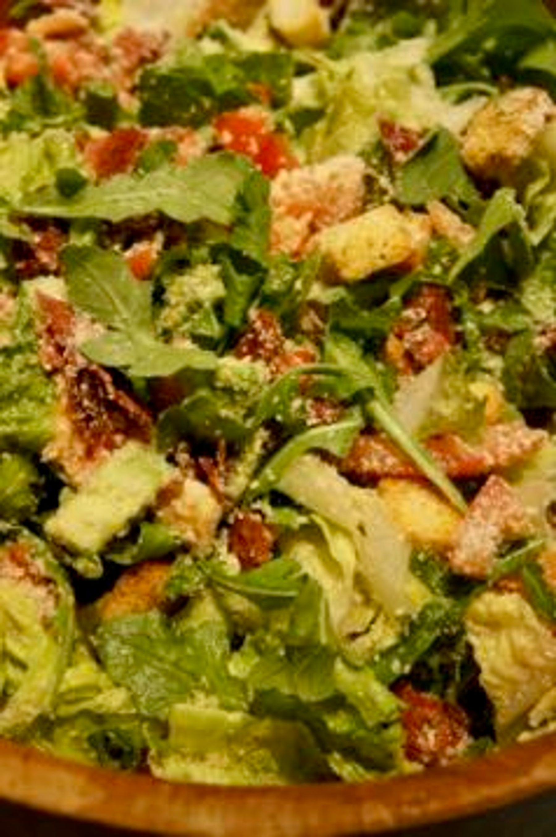 In a large bowl toss together the lettuce, bacon, tomatoes, almonds, avocado, parmesan cheese and croutons.