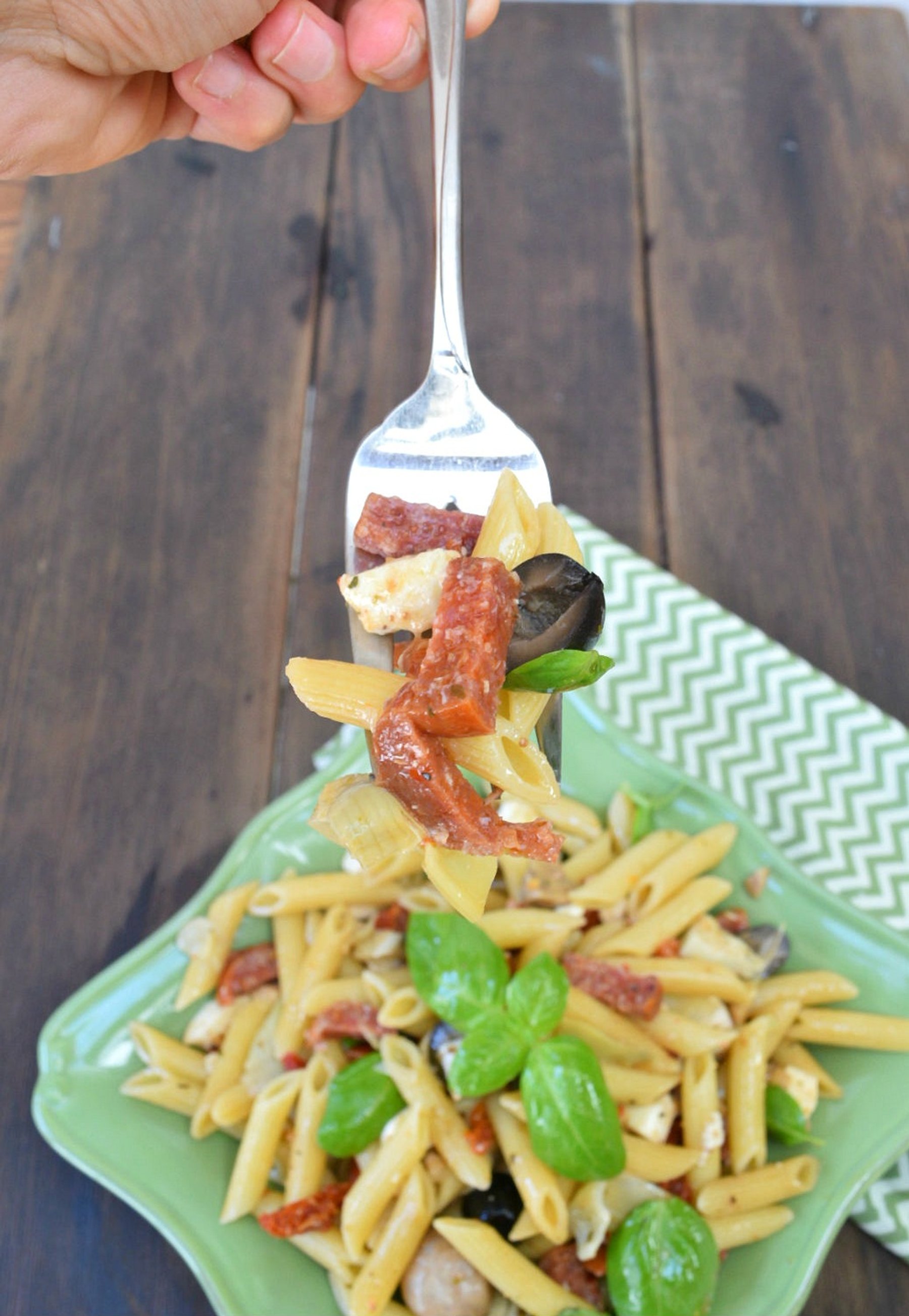Classic Italian antipasto together with penne pasta in a flavorful summer salad!