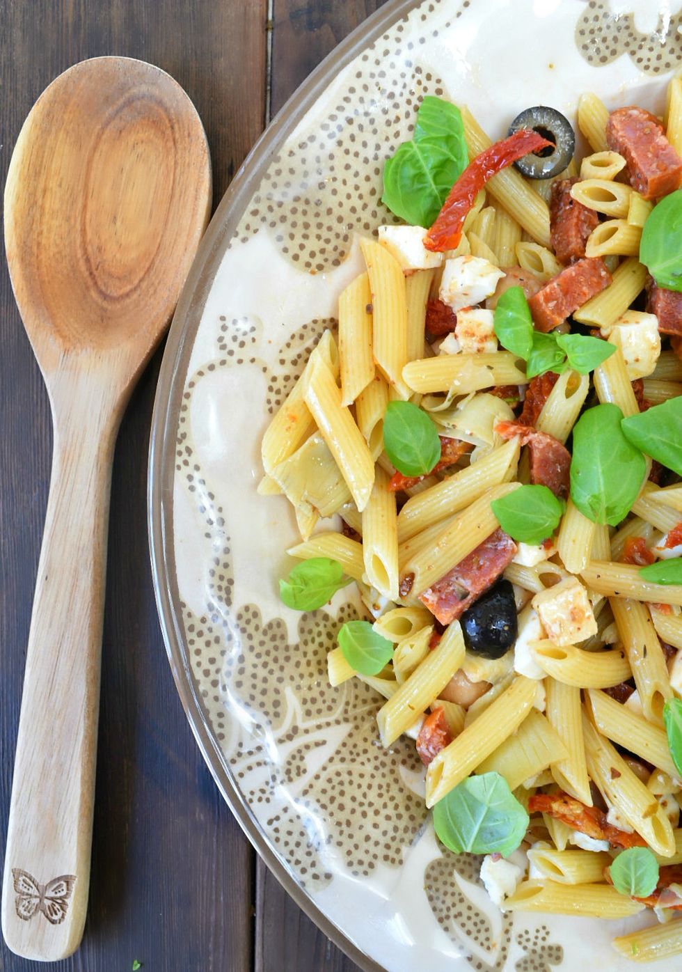 Classic Italian antipasto together with penne pasta in a flavorful summer salad!