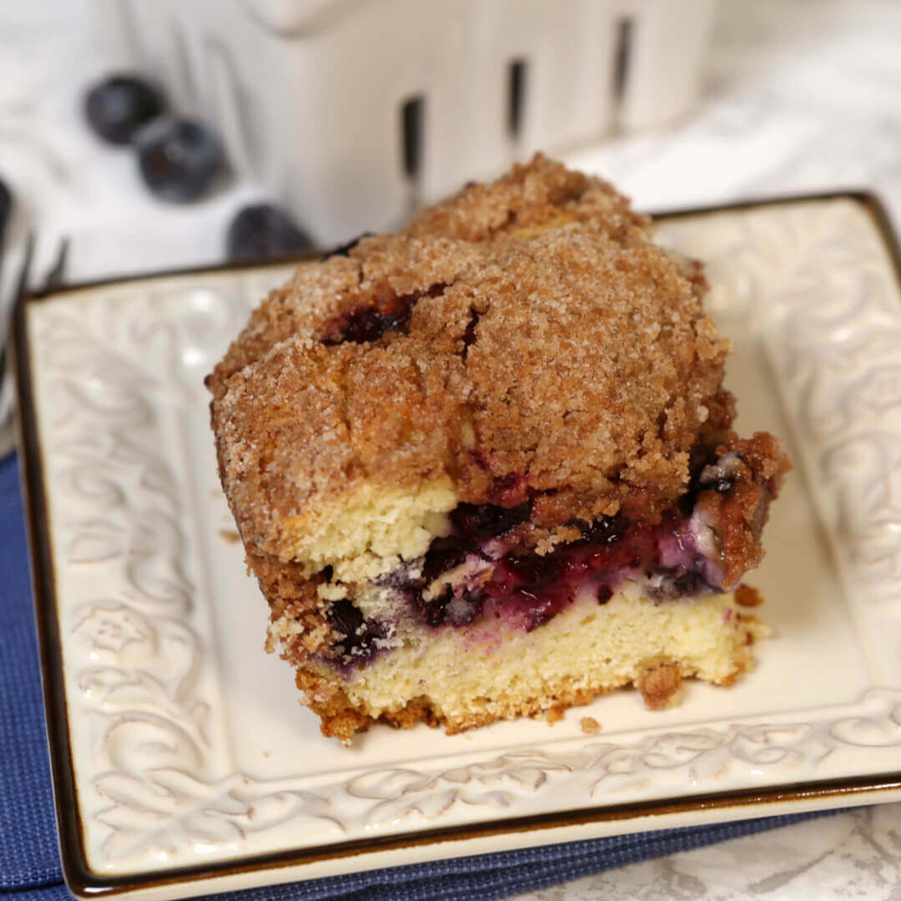 This Blueberry Coffee Cake streusel topping is one of my most cherished family recipes. It's been passed down for years and is the best blueberry coffee cake I've ever had.