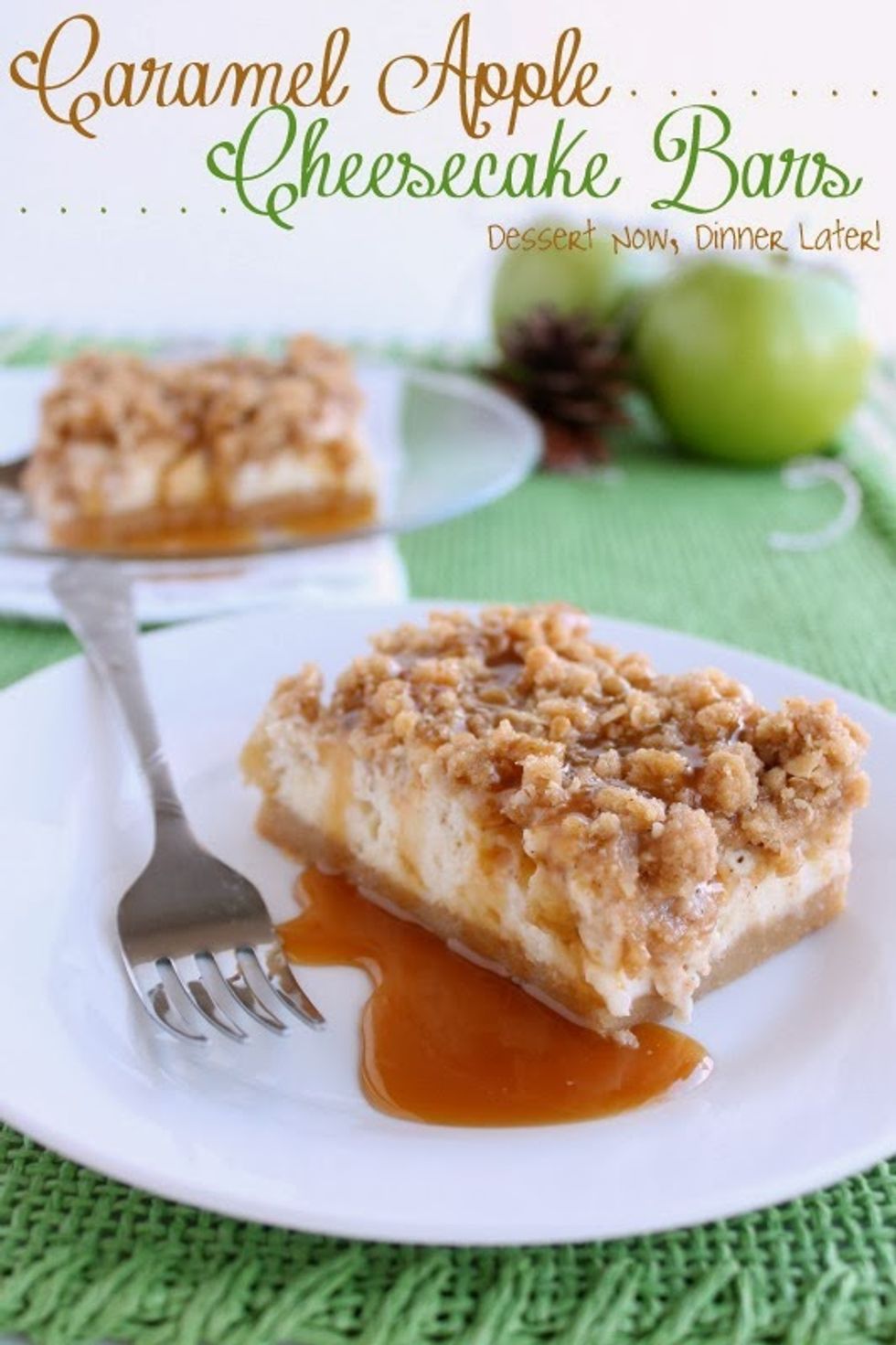 A brown sugar shortbread crust, smooth cheesecake layer, lightly tart apples, with a crunchy cinnamon streusel crust all drizzled with caramel.