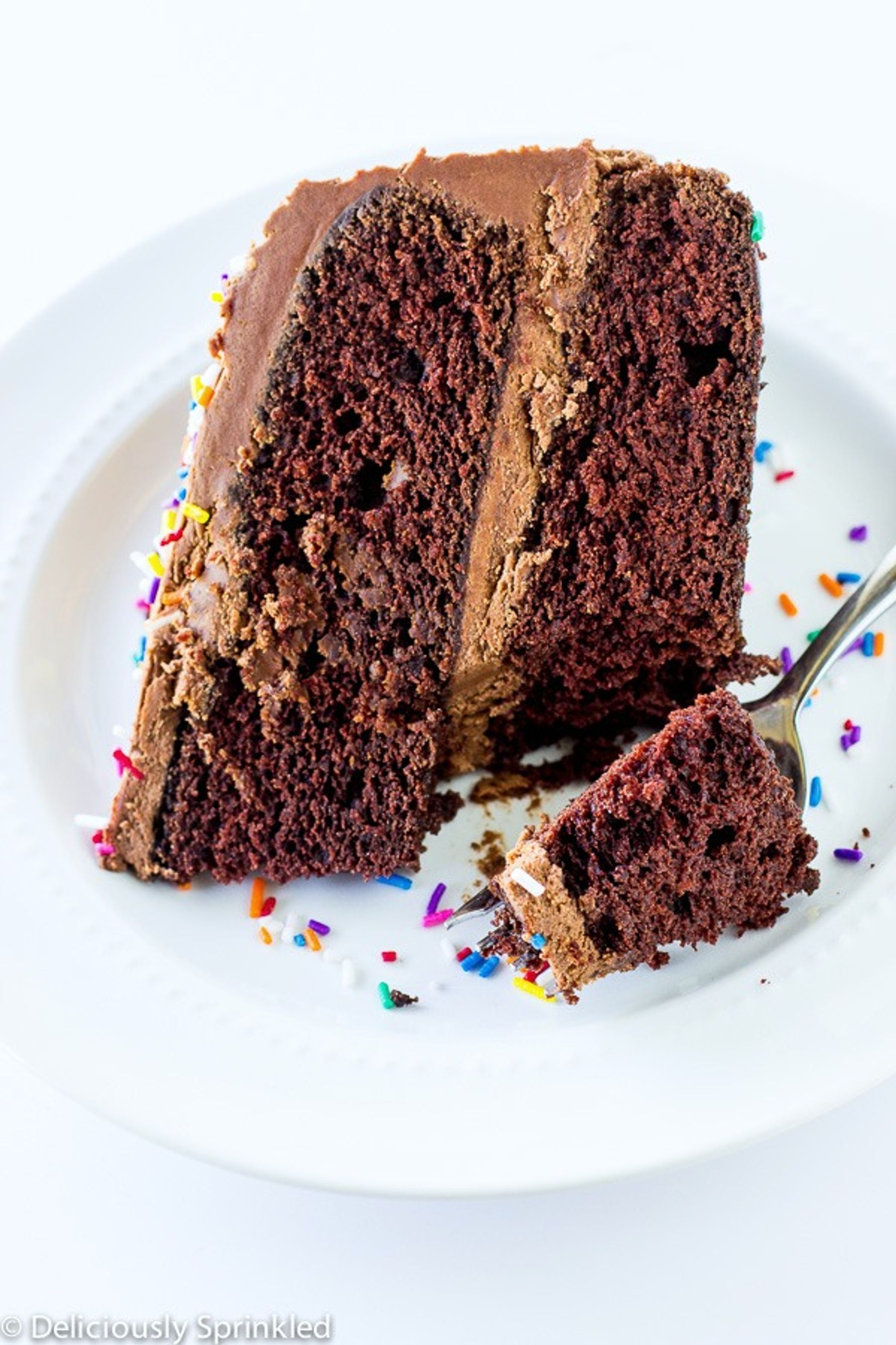 The BEST Homemade Chocolate Cake with milk chocolate buttercream frosting topped with sprinkles.