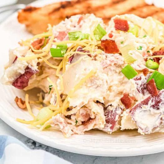 The flavors of potato salad get a serious upgrade when combined with a loaded baked potato salad! Stuffed full of bacon, cheese, herbs, and green onion the flavor of this red skin potato salad is just unbeatable. This potato salad is made with simple ingredients and is a delicious American classic.