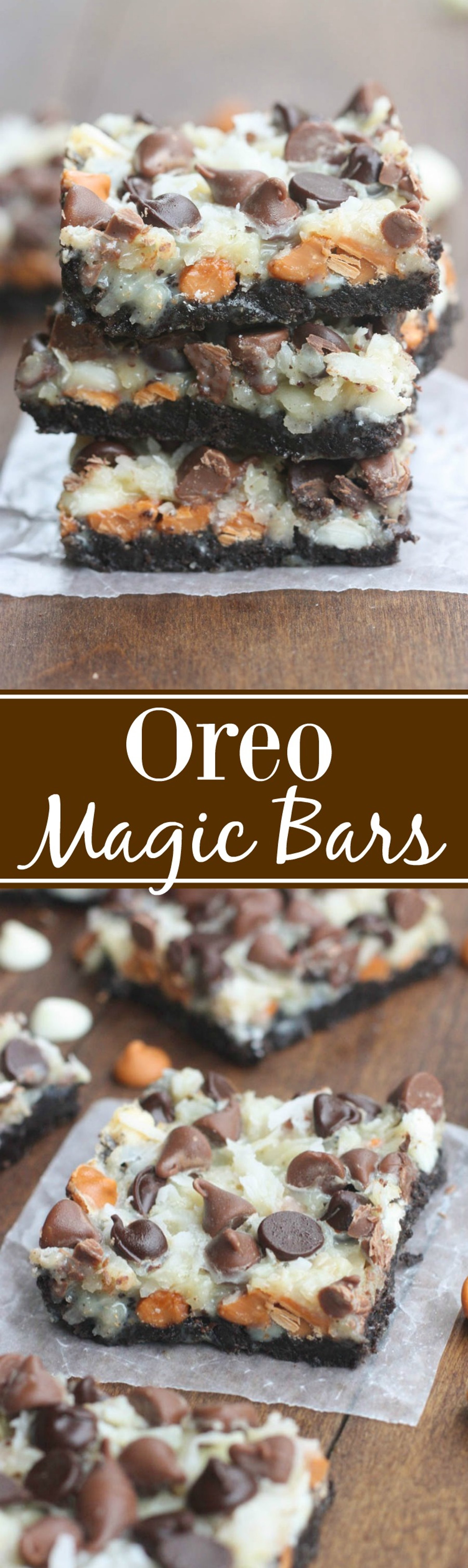 Oreo Magic Bars – Seven simple layers of Oreo chocolate bliss starting with an Oreo crust, three different types of chocolate chips, coconut and nuts. This is the EASIEST dessert, and always a party favorite.