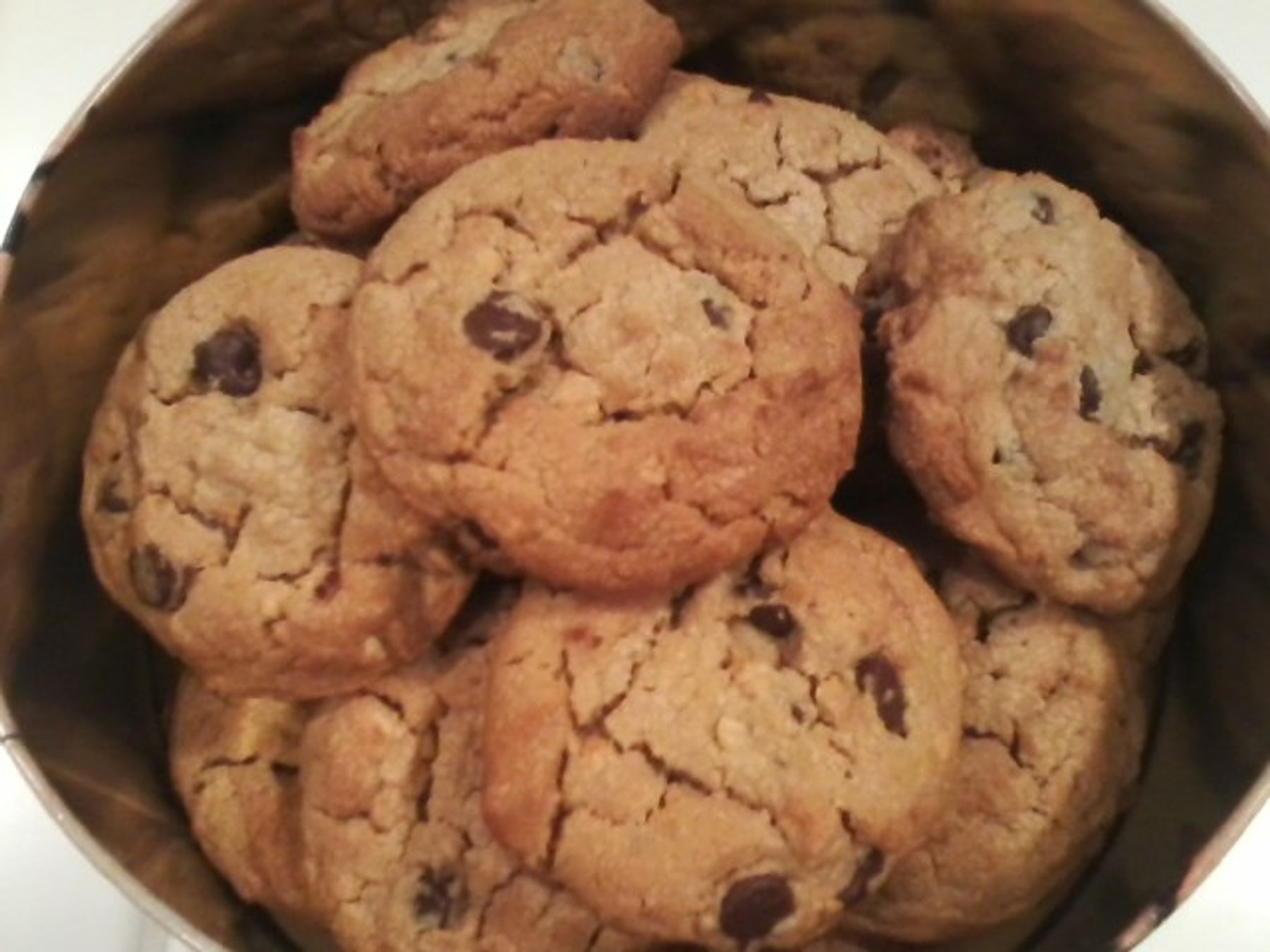 Heat oven to 375. In a standing mixer blend the butter, sugars and salt until creamy. Beat in the egg, peanut butter, baking soda and vanilla. Add the flour. Stir in the chocolate chips. Line a large baking sheet with parchment paper. My baking sheet is 14x17 and the whole batch will fit on that one sheet. I use a scoop that is just shy of 2" across. You should get 18-20 cookies, and they don't spread that much, which is what I love about them. Take a fork and crosshatch each cookie. Bake 10-12 minutes, or until just starting to brown on the edges.