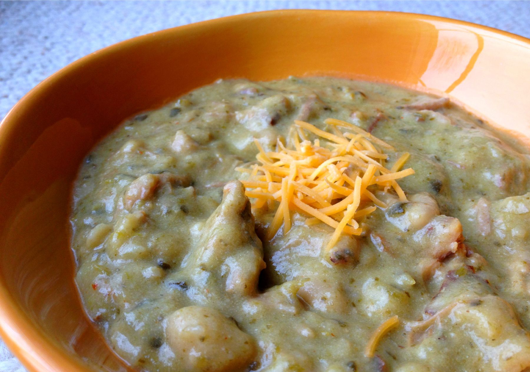 Add in White Beans, Chicken or Pork and 1/2 Shredded Cheddar Cheese. Stir in sour cream.