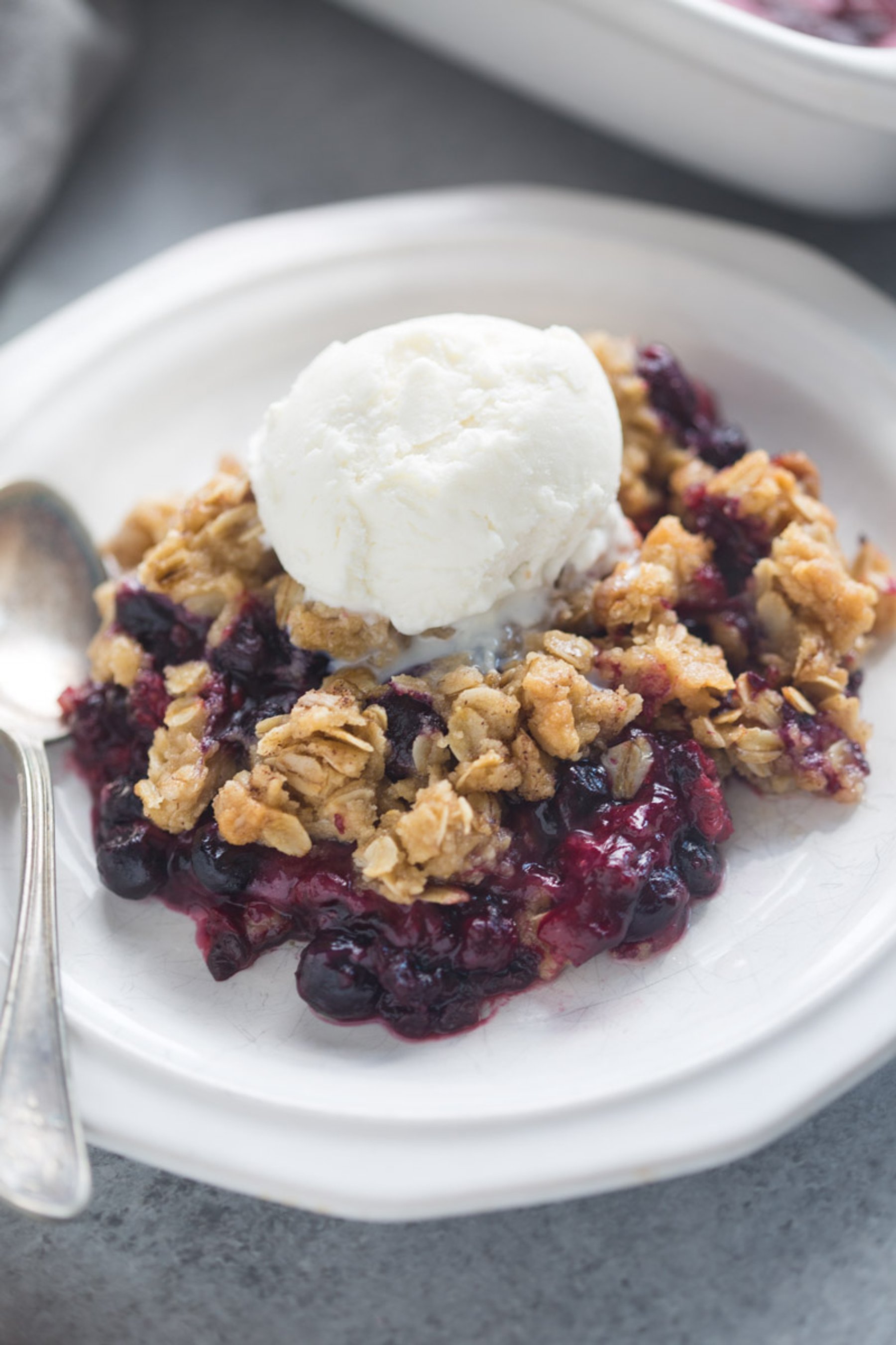 The easiest Triple Berry Crisp made with frozen berries for a juicy berry filling nestled under a crispy oat topping.