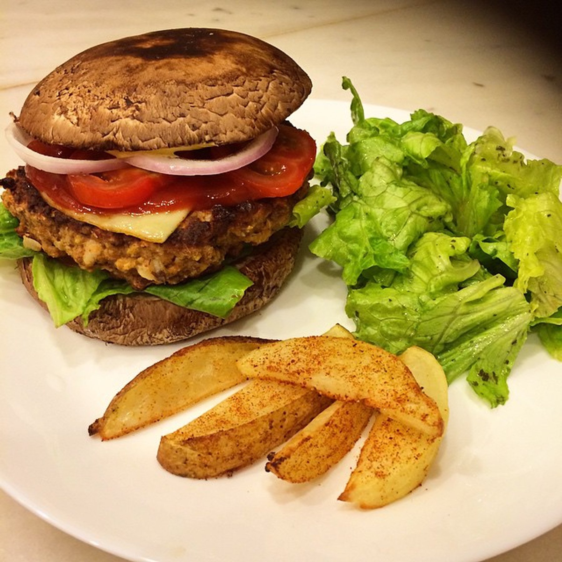 Was craving burger, did not want to eat meat and bread . BIG DILEMMA! But I came up with this yummi #vegetarian burger with salad and some baked \\\"fries\\\" at the side. And you know what? If you leave out the cheese and egg in the patty it\\\'s even #vegan.. Satisfied every burger craving :)