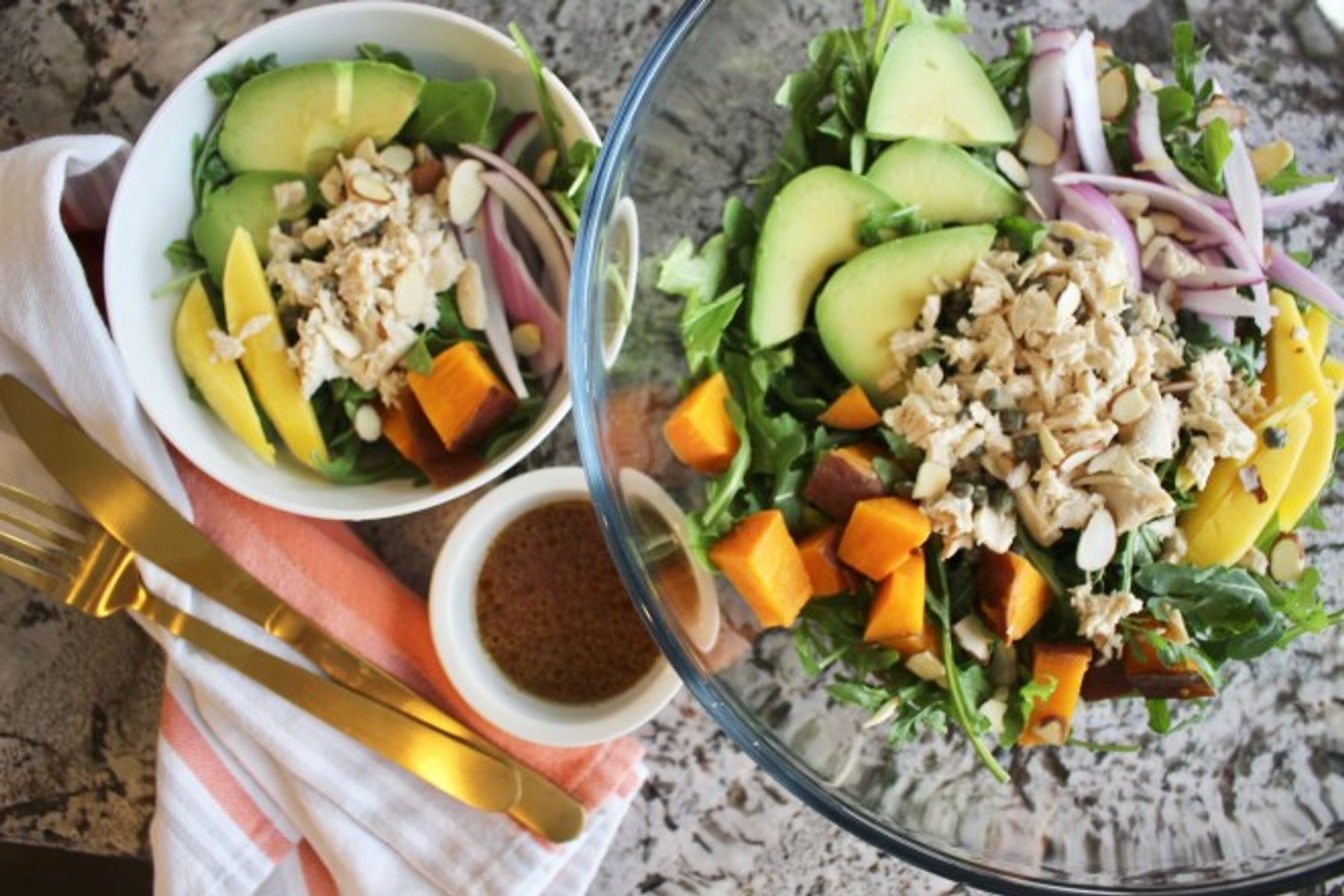 Place arugula in large bowl and top with the tuna salad, red onion, mango, sweet potato, avocado and sliced almonds