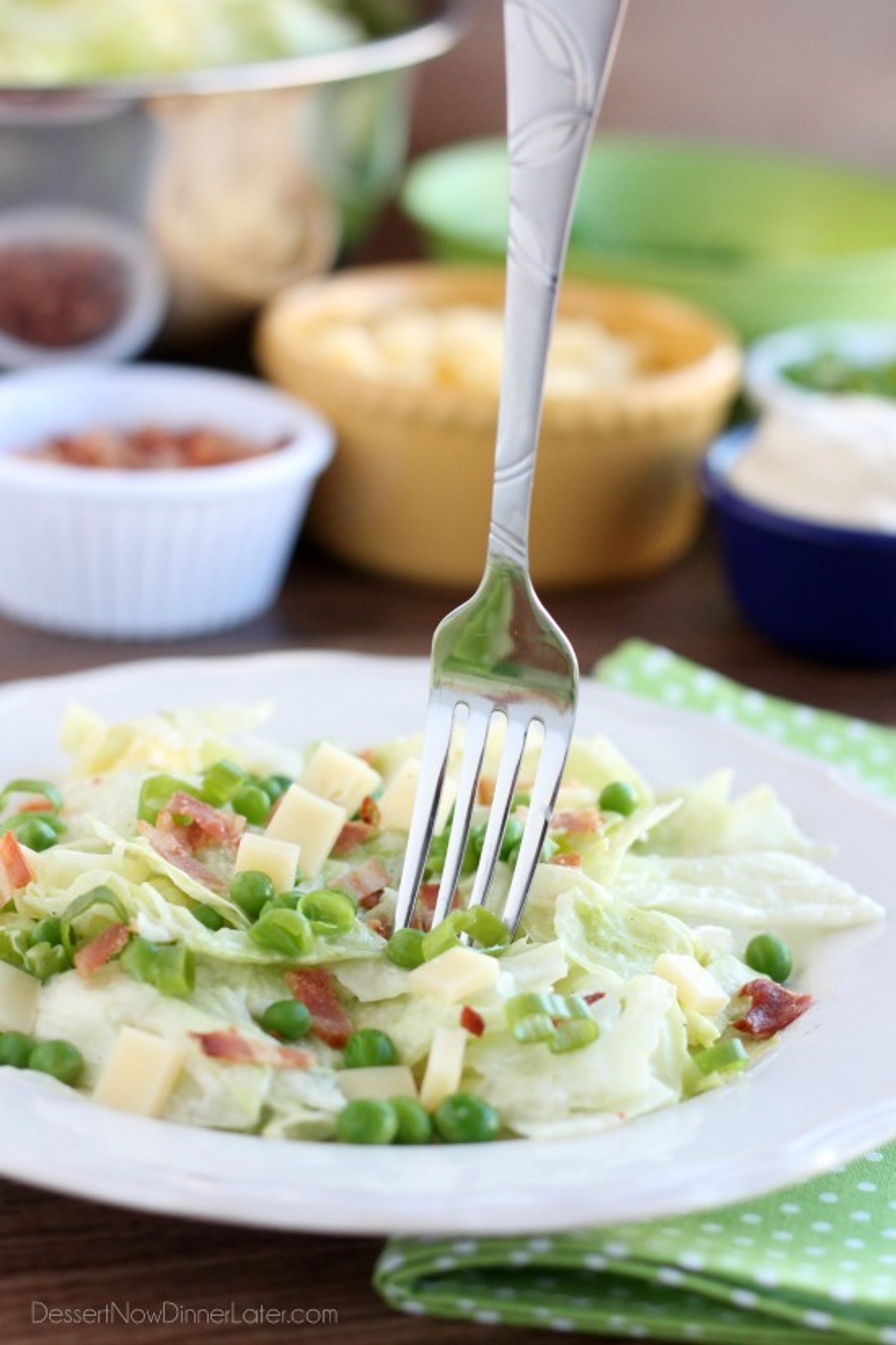 Sarah’s Salad from Utah’s Lion House restaurant uses crisp iceberg lettuce, peas, bacon, green onions, and swiss cheese tossed in a simple, sweet dressing.