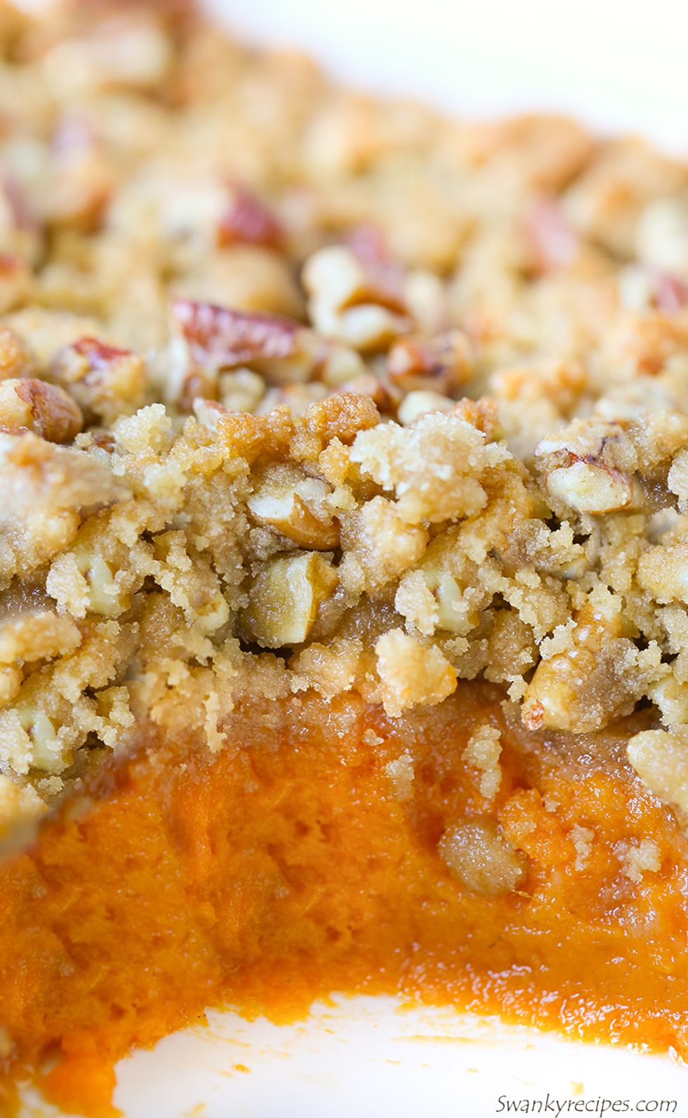 Truly a Southern Staple, this Sweet Potato Casserole made with fresh sweet potatoes, sugar, butter and spices. It has a crunchy buttery, brown sugar and pecan topping served in this casserole is the ultimate staple side dish. Perfect side dish for Thanksgiving and Christmas holiday parties.