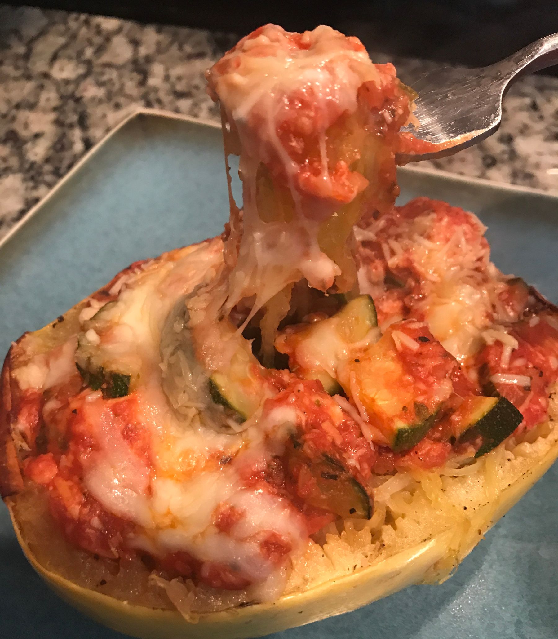 Divide the tomato sauce mixture in half between the 2 pieces of squash and spoon into the shells.