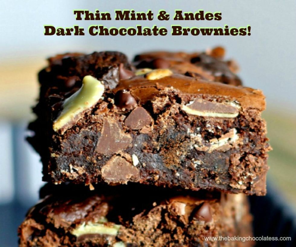 Tantalize your taste-buds with these moist, dense, fudgy, dark chocolate brownies graciously loaded with Girl Scout Thin Mints and Andes Mints. 'WoW' factor included!