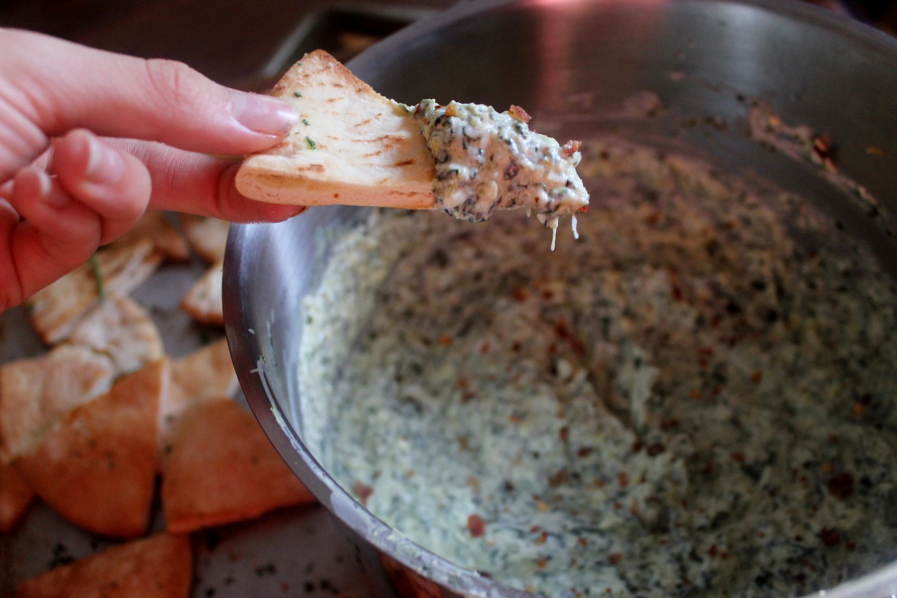 Three Cheese Skinny Stovetop Spinach and Artichoke Dip with Parmesan Pita Chips