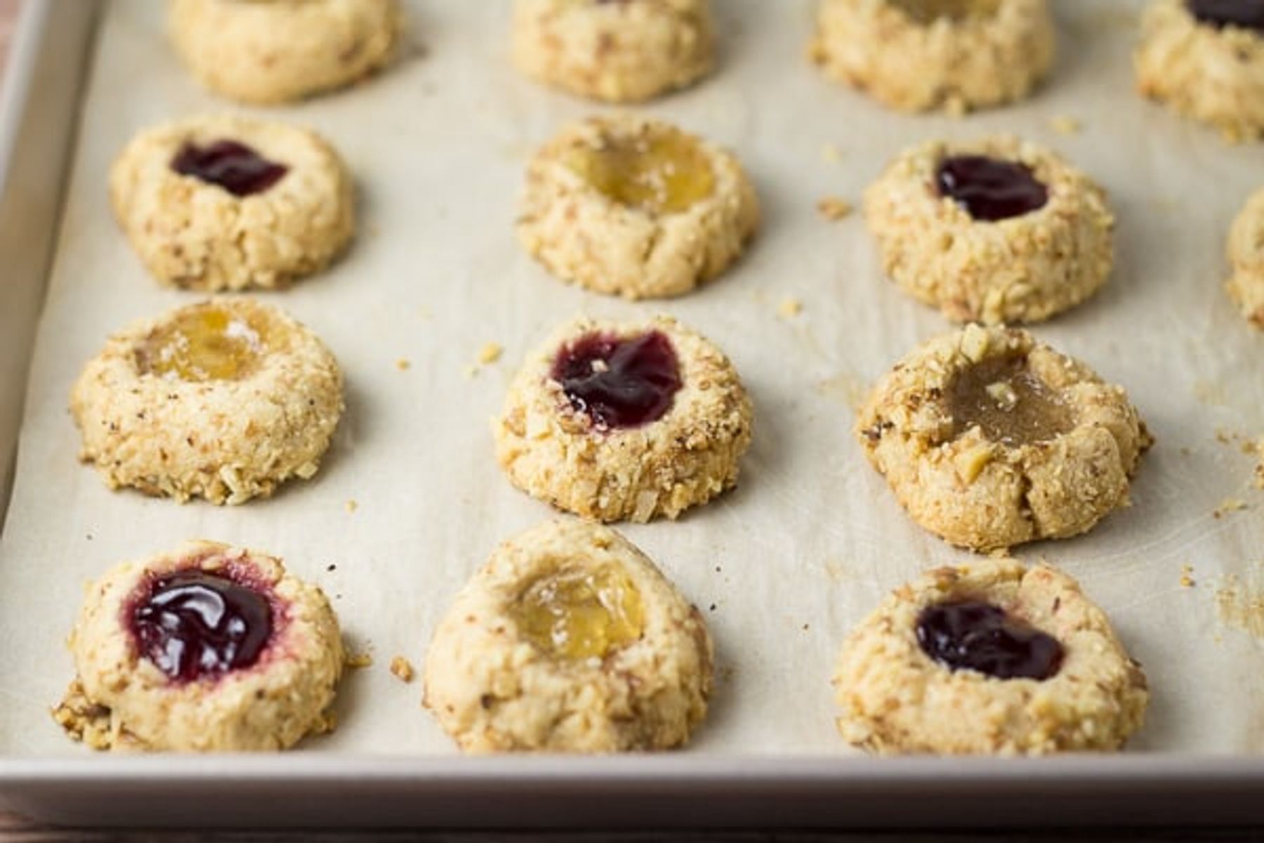 These thumbprint cookies are made using sugar cookie dough. The middle of the cookie is pressed with the thumb and jam is spooned into the middle.