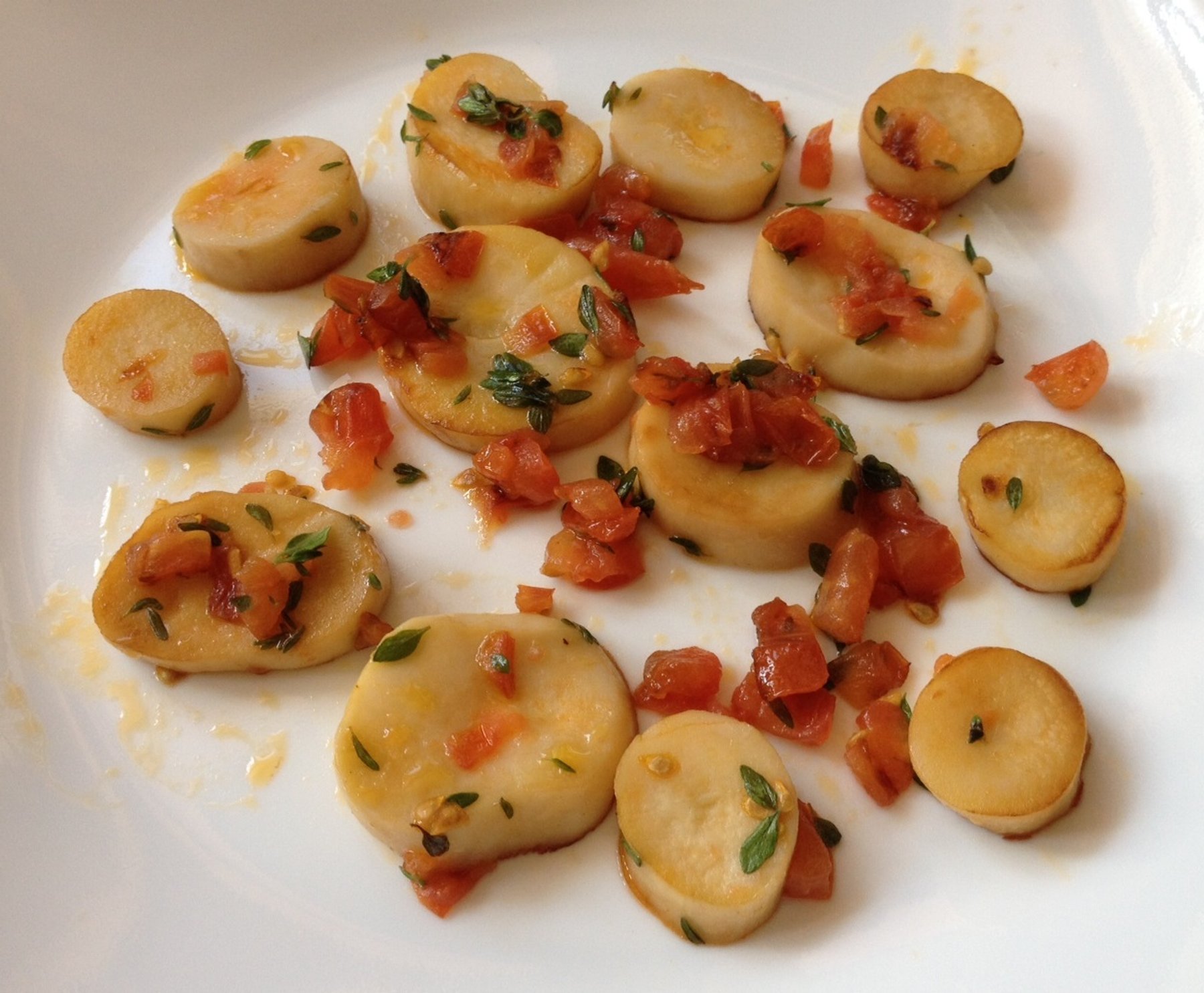 These trumpet mushroom look like scallops, marinated in thyme tomato sauce, they serve as wonderful appetizer.