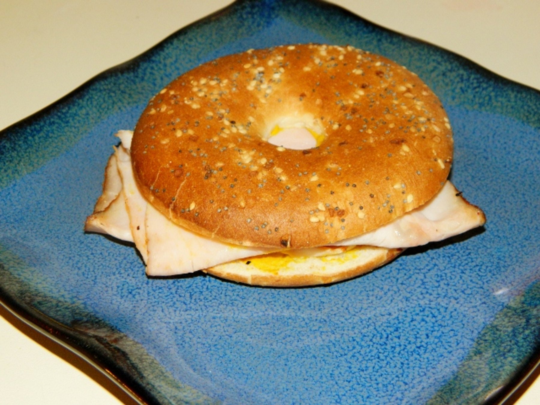 Open bagel and spread mustard on both slices and top with turkey slices (3) and 1 slic e of cheese. Toast in toaster oven until bagel is toasted. Remove from toaster oven and place lettuce and tomato inside sandwich. Now enjoy!