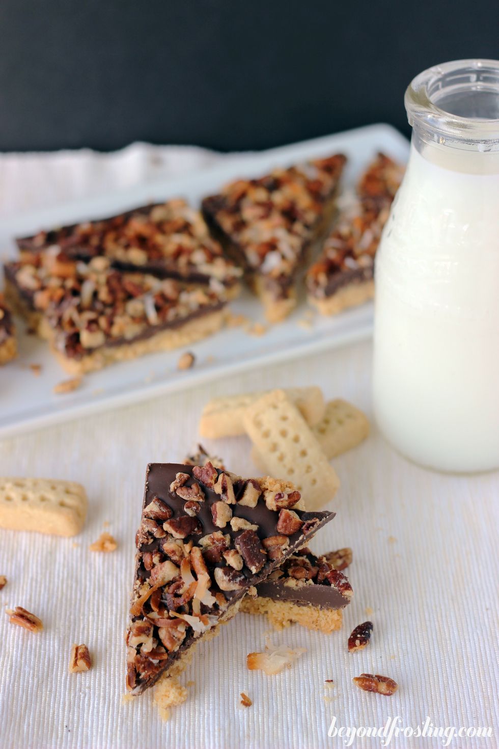 This Toasted Pecan Shortbread Bark is a shortbread base with a layer of melted dark chocolate, toasted pecans and toasted coconut.