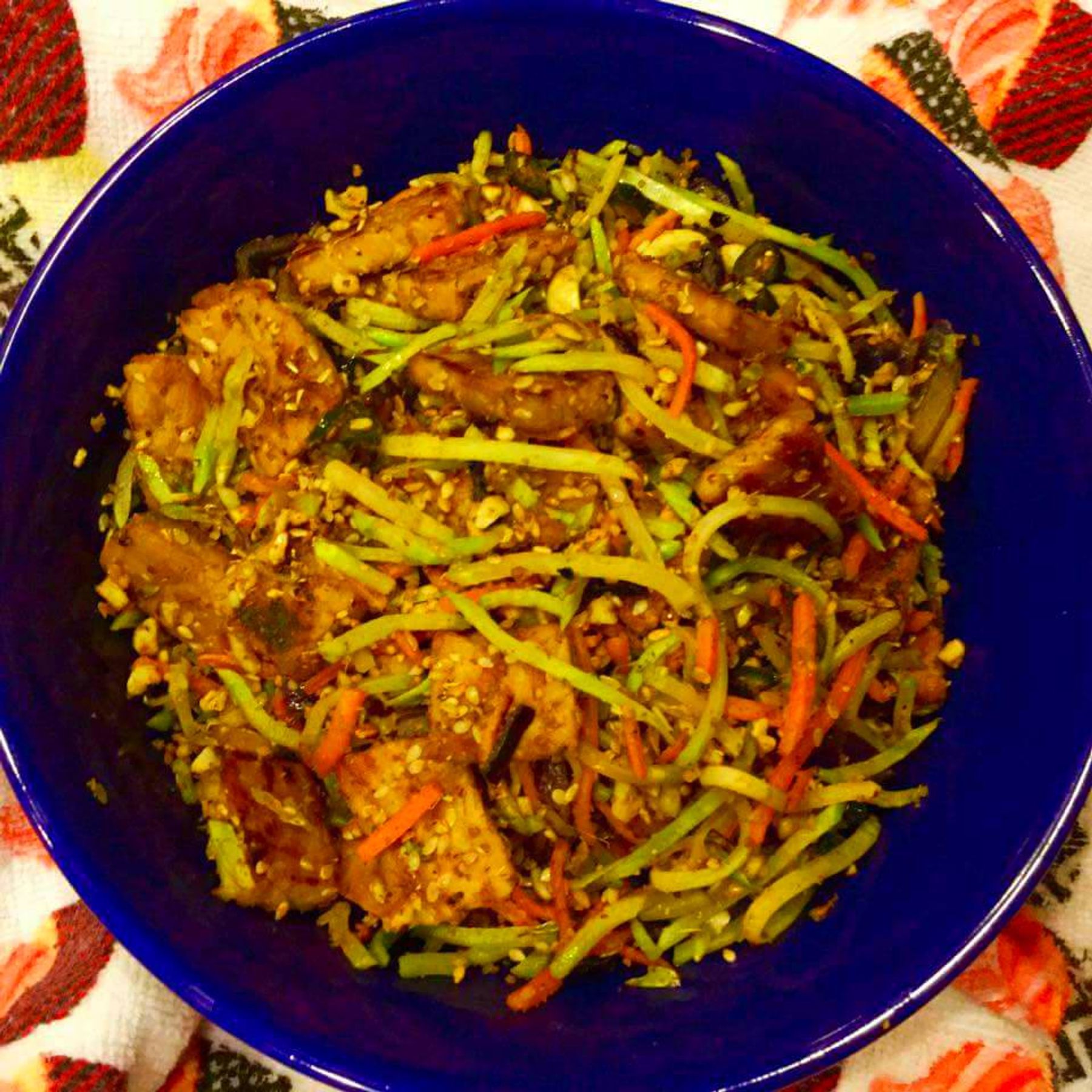 This dish can be had as a salad too. Its flavored with sesame seeds, peanuts and spices. Tofu is a good substitute for vegetarians.