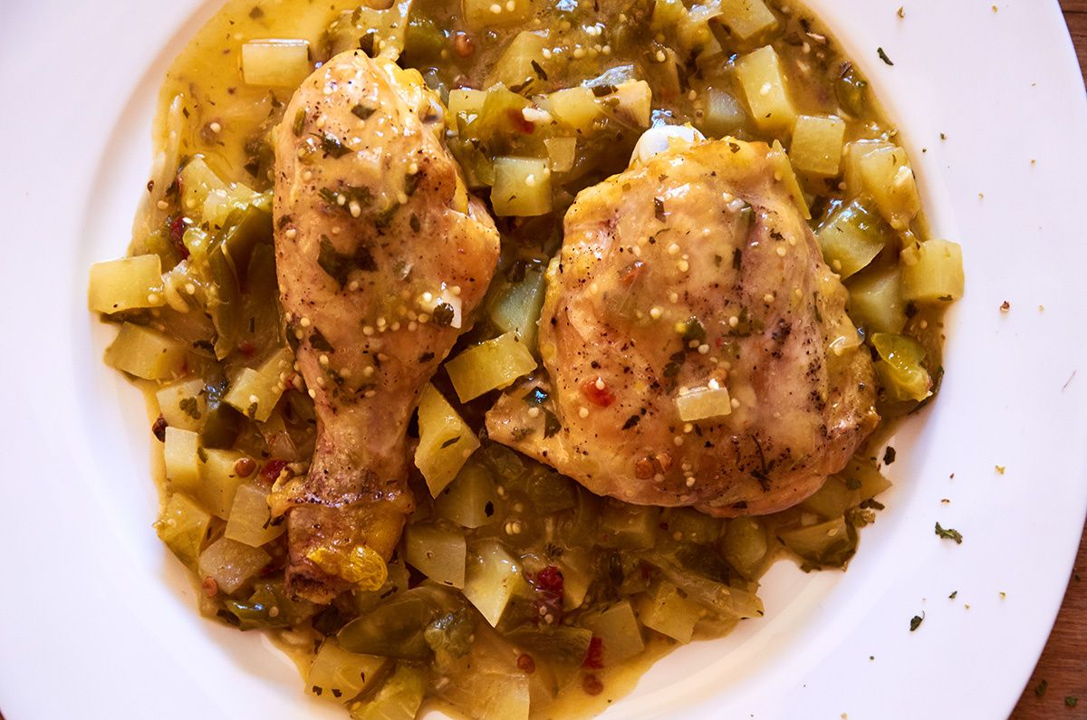 Tomatillo chicken, called pollo entomadado, prepared with skinless chicken thighs and legs, and white potatoes simmered with tangy tomatillos and chipotle chile in adobo sauce.