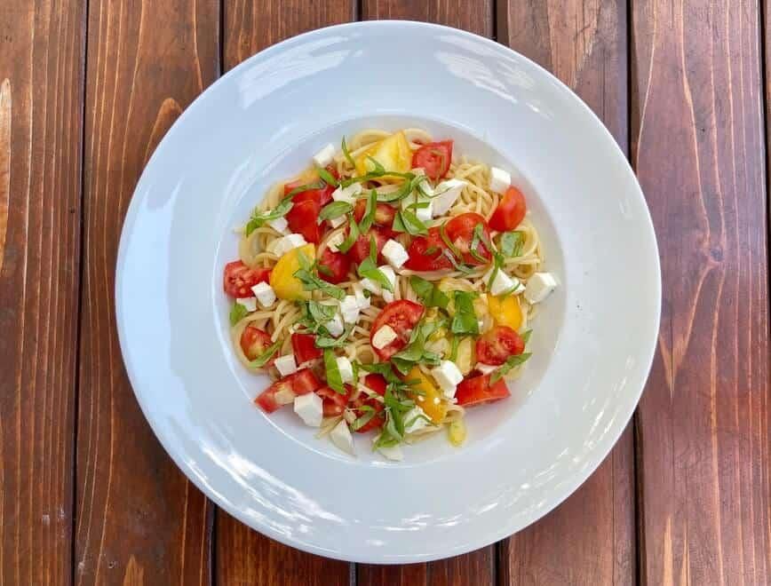 Light and Tasty Tomato Basil Mozzarella Pasta for a Hot Summer Evening. It's a light mouthful of silky pasta that will transfer you to a happy place. And thanks to the butter-coated spaghetti (my secret ingredient), it will leave you satisfied and refueled without feeling heavy.