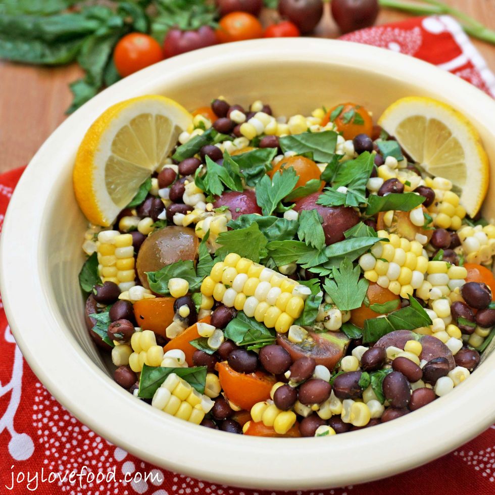 1.Add tomatoes, corn, black beans, basil and parsley to a large bowl.