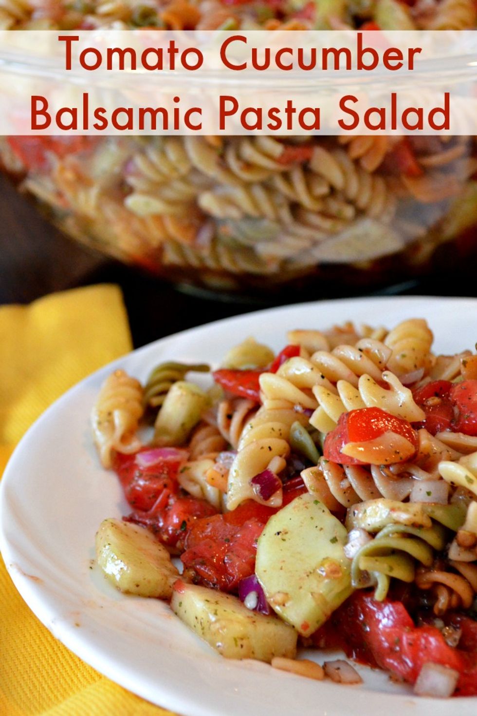 This Tomato Cucumber Pasta Salad includes pasta, tomato, cucumber, purple or sweet onion, Tomato Basil Ms. Dash or fresh Basil, Balsamic vinegar and Olive Oil.