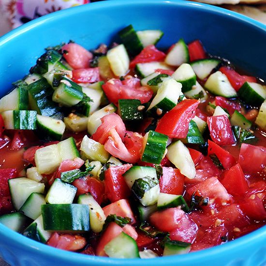 Fresh cucumbers & tomatoes tossed in vinegar, oil, & fresh mint make a refreshingly simple summer salad.