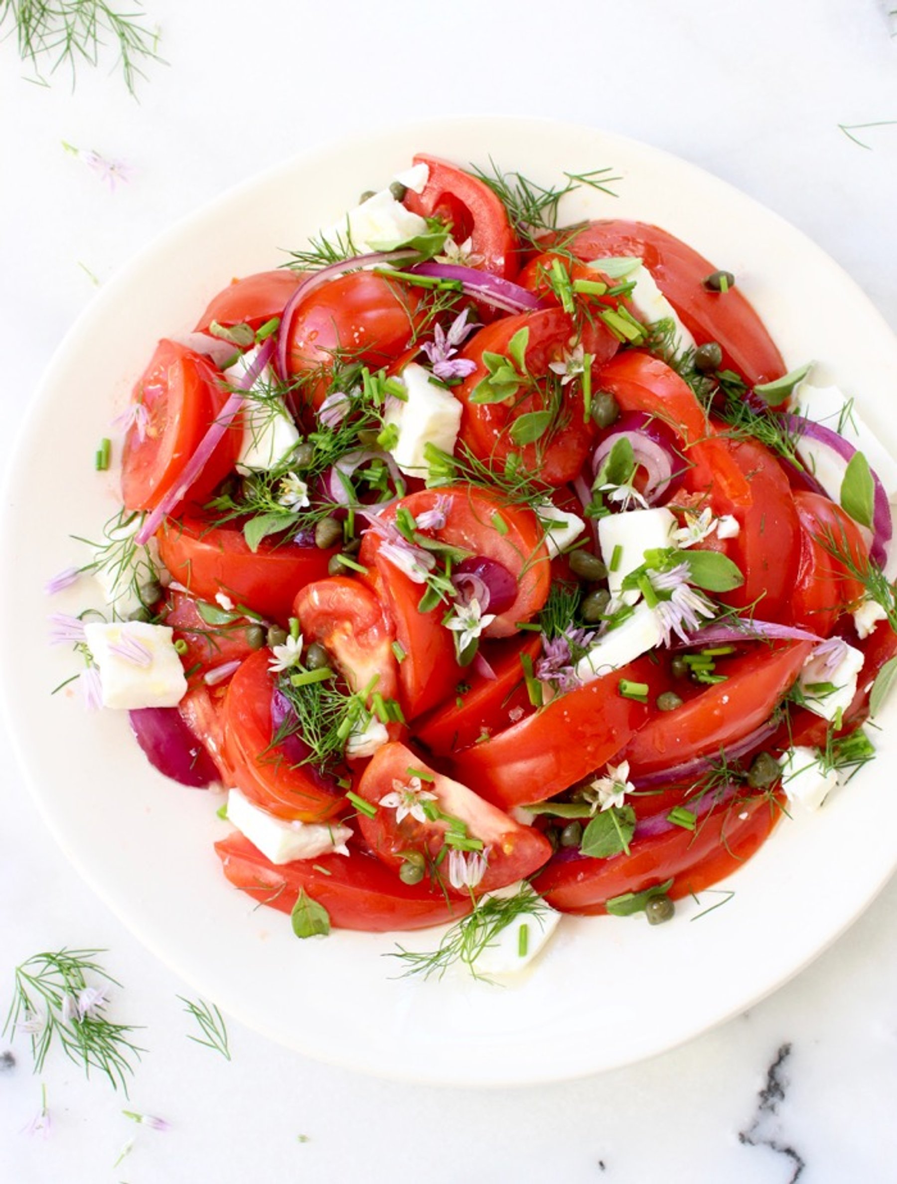 A simple Mediterranean heirloom tomato onion salad with lots of fresh herbs, feta cheese, dressed in a lovely olive oil and vinegar dressing!