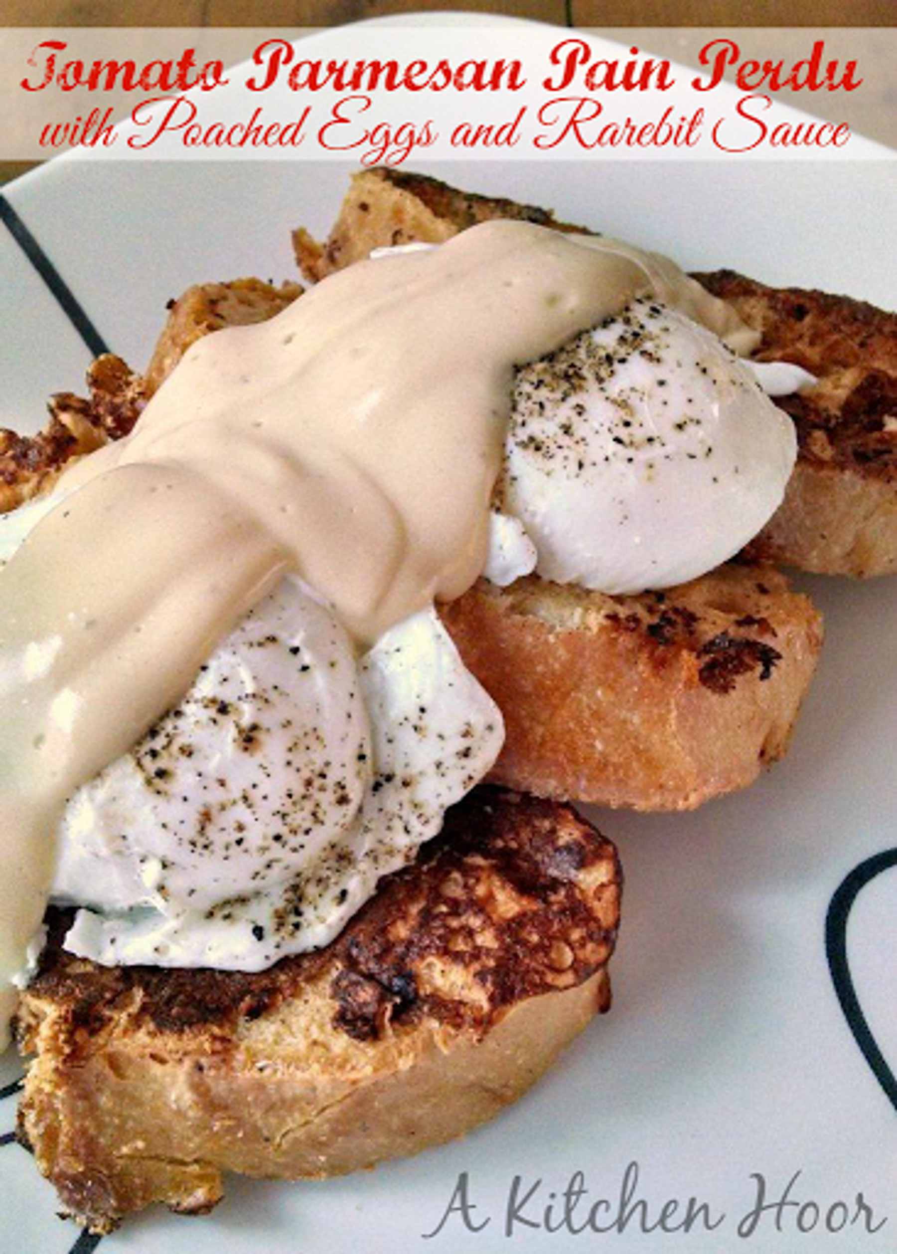 Tomato Parmesan Pain Perdu with Poached Eggs and Rarebit Sauce