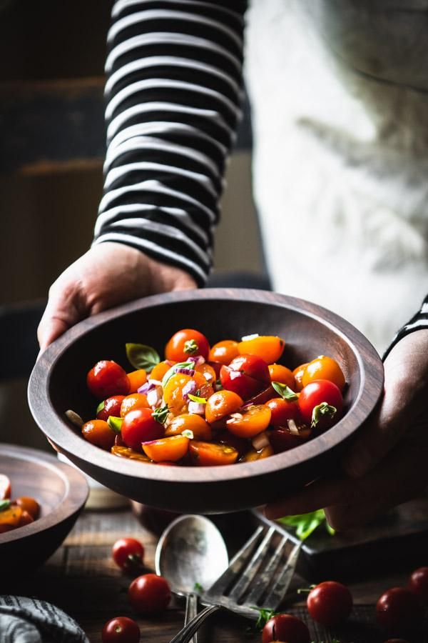 - In a separate bowl or jar, whisk or shake together olive oil and vinegar. Pour over tomatoes and toss to coat. Season with salt and pepper, to...