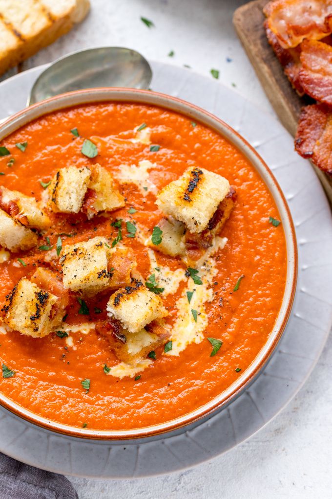 Tomato soup with Gruyere and bacon croutons