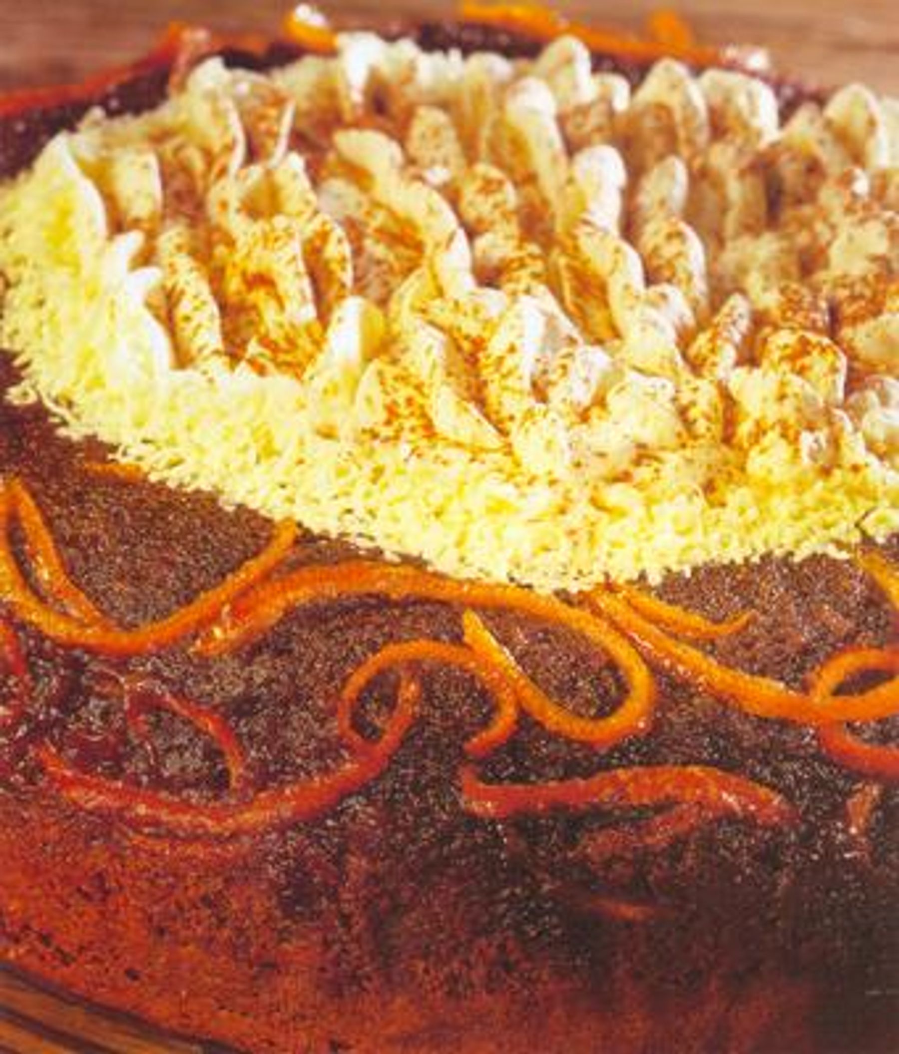 8. Arrange the peel then the orange slices on the caramel. Top with the chocolate mixture and smooth the top. Cover with a pleated sheet of lightly oiled tin foil.