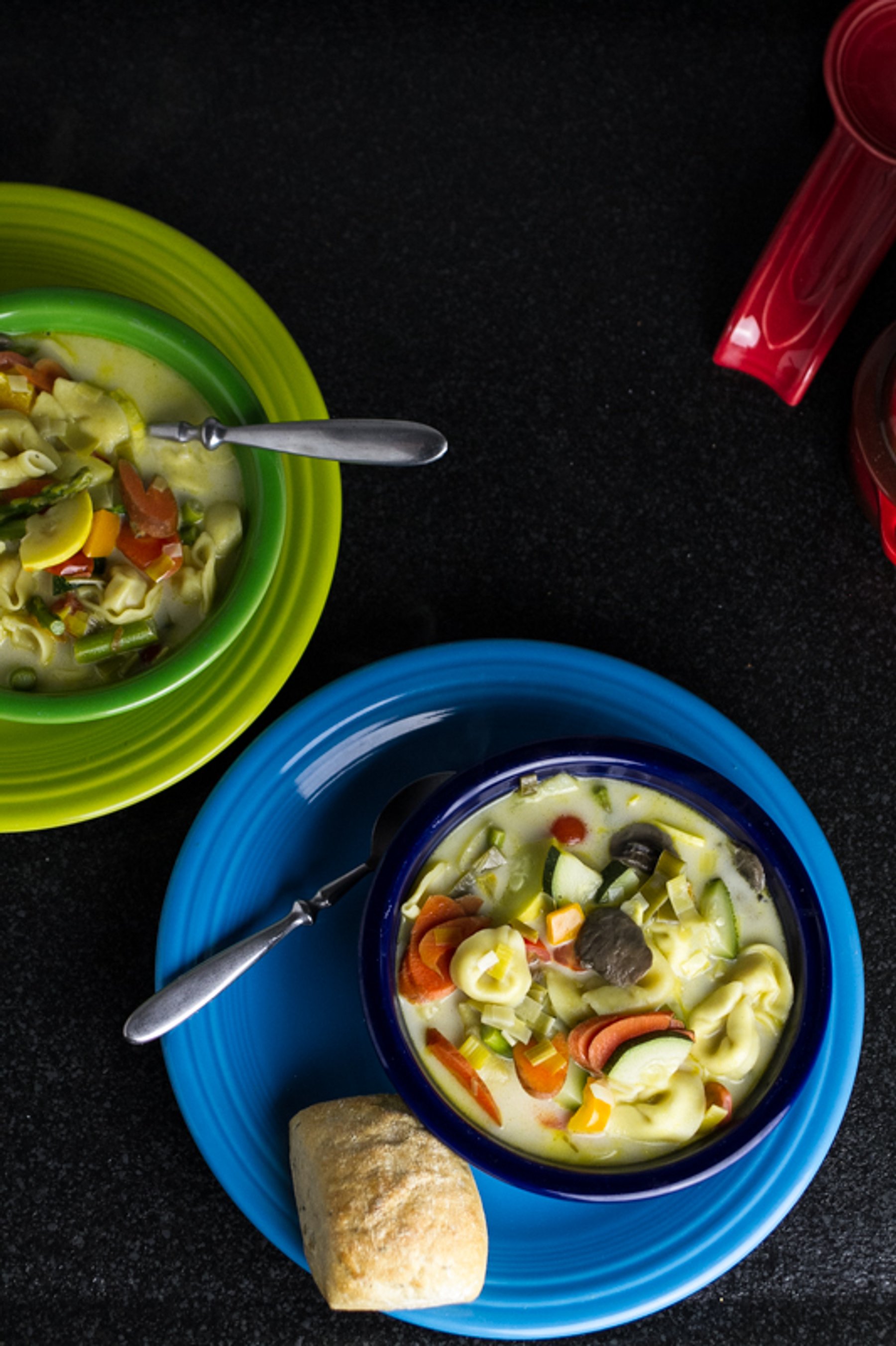 chicken or vegetable stock, heavy cream, cheese tortellini, leeks, carrots, bell pepper, mushrooms, zucchini, yellow squash, asparagus