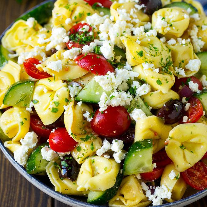 This Greek tortellini salad is a mix of cheese tortellini, cucumbers, olives, tomatoes and feta cheese, all tossed in a garlic and herb dressing. The perfect summer side dish or meatless main course!
